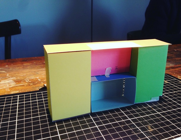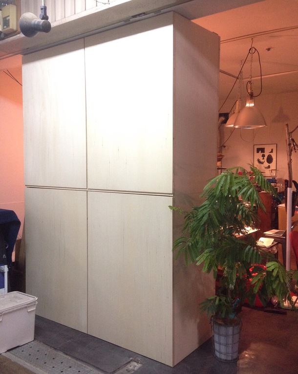 こんな大きなキャビネットも自作しました。両面トータル8枚扉。中には工具や資料、書籍、建築模型用品が入っています。これでショップと設計事務所が一つの空間に存在していてもすっきり見せられます。