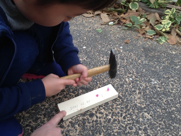 息子にも隠し釘のピンクのゴムを拾ってもらったり手伝ってもらいました。トンカチでトントンするのも気に入っていたようです。