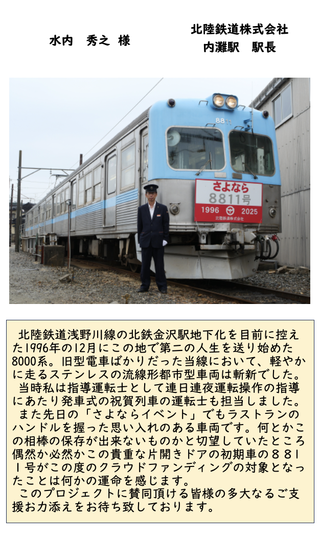 北陸鉄道株式会社 内灘駅 駅長の水内 秀之様より、応援メッセージをいただきました。