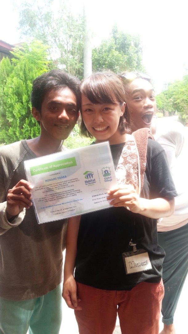 それは「伝えること」です。世界中の貧困は、テレビやインターネットで見るものと、実際に自分の目で見、感じるものとは全く違います。私はフィリピンで貧困を目の当たりにし、直接そのことを日本の人々に伝えることが大切であると感じました。人に伝えることで1人から2人に、2人から4人にとどんどん大きくなり、そのような積み重ねが、住居貧困はじめ、貧困の解決につながると願っています。