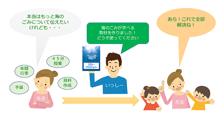 子どもたちにとって読みやすく、海やごみ問題について興味と関心を持ってもらえるようにします。そのために通常授業で学ぶごみ問題や学校での取り組み、 特に小学4年生が社会科の授業で学習する生活ごみに関する内容(3Rなど) と掛け合わせて、現実生活との繋がりをイメージできるようにし、一人一人の行動に繋げてもらいます。期間としては2024年9月〜11月を予定しています。