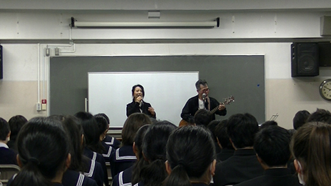 今回は、中学1年生70名の前で、玉貴が自らのいじめ体験を語り、そして「とべない小鳥」を唄い、その後子供たちとデシスカッションをしました。