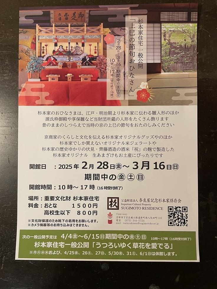 ご支援くださったみなさまへ 寒波が遠のいた今日の京都は穏やかな一日でした。皆様にはいかがお過ごしでしょうか。さて、この春の一般公開は、昨日2月28日から<上巳節句おひなさん>を開催しています。公開日は、3月2日(月)、3月7日(金)・8日(土)・9日(日)、3月14日(金)・15日(土)・16日(日)。平日は閉館。