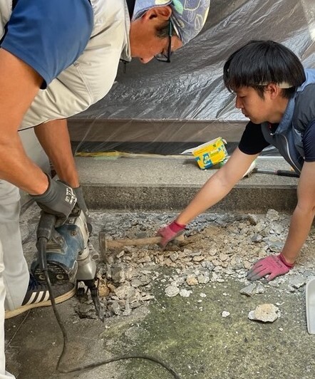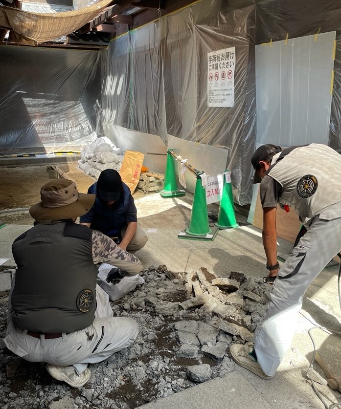 叩き工事は左官さんの仕事です。ご見学者のみなさまの最後の打ち水を終え、連日35度超えの酷暑の中、掘削・撤去工事が進められています。