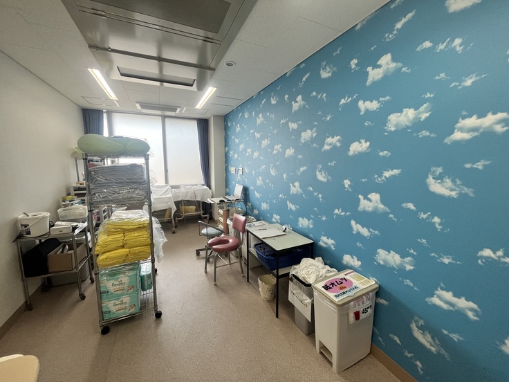 新生児室の壁紙が青空をイメージしたデザインに生まれ変わりました。やわらかな空色に包まれた空間で、新しい命のはじまりをあたたかく見守ります。