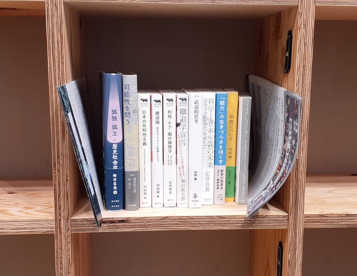 まちごこち文庫の本棚コーナーには私たちの源流である撤退学の書籍も!
