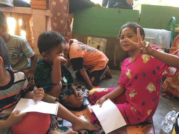 また、活動がお休みのある日、現地の友人にお願いされ、避難テントで簡単な日本語の勉強会を行った時でした。最前列で元気に勉強する子供たちの後ろの方に、ノートを持参して一緒に勉強しているお母さんたちの姿を見つけました。