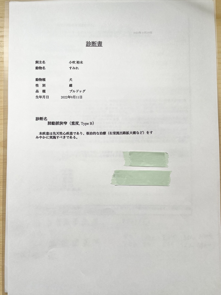 獣医師によれば『肺動脈弁狭窄症に罹患した小型犬の開心術の報告はいくつかあるものの、大型犬 その中でもブルドッグに関しての正式な手術報告をみつけられず、日本ではブルドッグが手術を受けた症例はおそらく無いでしょう。』ということでした。すみれが手術を受ける事が出来れば、日本の獣医療への大きな一歩となれるかもしれません。