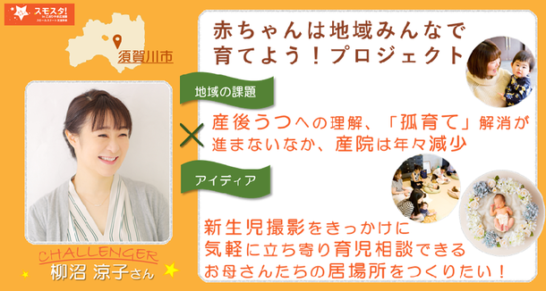 産後の体調の変化や気分の落ち込みの辛さから救ってくれたのは、家族や産院でのサポート以上に同じく子育て中の母親たちとの会話や交流でした。そんな自身の経験から、自宅と産院以外に産後間もない母親が気軽に立ち寄り悩みを相談出来る居場所が必要だと感じました。ニューボーンフォトの撮影で立ち寄ってもらう事をきっかけに、家族や産院以外にも育児の悩みを相談出来る相手や場所がある事を知ってもらい、「孤育て」から「地域みんなでの子育て」へと福島県を変えていきたいです。