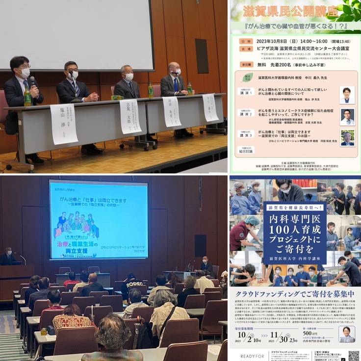 がん治療と心臓血管疾患をあつかう「腫瘍循環器」について知っていただく内容で、あいにくの雨模様にもかかわらず、多くの方々に参加いただきました。滋賀県民の皆さまの健康寿命の延伸に貢献できるよう、滋賀医科大学循環器内科と内科学講座は今後も研鑽を重ねてまいります。