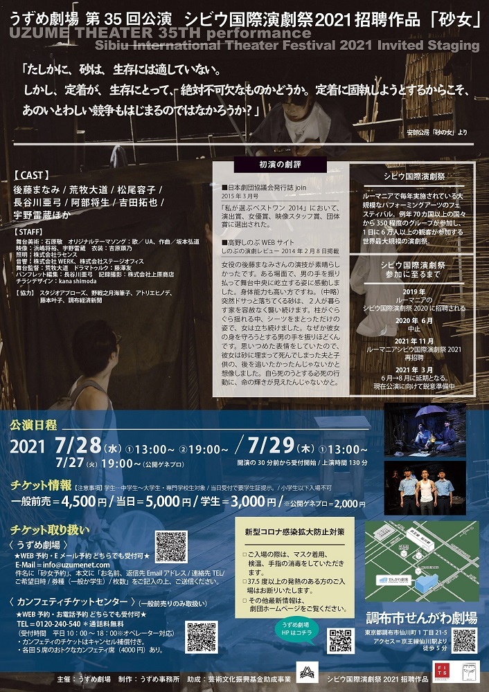 7月28日、29日に「砂女」の国内プレ公演を行います。2014年の初演では、超満員になる話題作でしたが、今回は7年ぶりの再演になります。 そして、国内で「砂女」を見ることのできるラストチャンスです!
