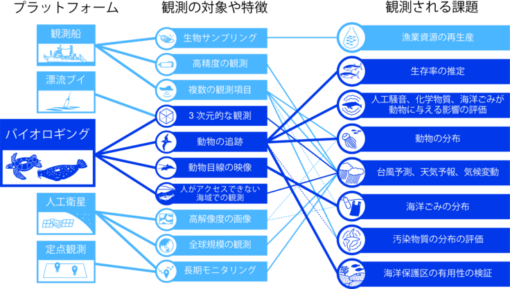 この論文は、バイオロギング(動物に記録計を取り付け、行動や周辺環境を計測する手法)の活用方法をレビューしたもので、バイオロギングが海洋におけるさまざまな課題の解決に貢献できることを紹介しています。