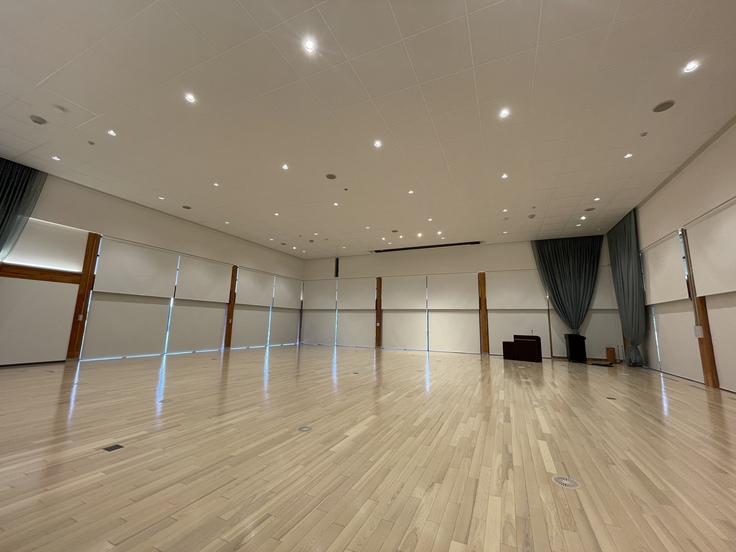 今回の上演会場は、劇場やホールではなく、2023年7月に開館した青葉山公園「仙臺緑彩館」という新しい公立施設です。「市民の憩いの場や観光客が楽しめる施設(HPより)」としてビジターセンターの役割を担う場所だそうです。会場となる交流体験ホールは3面をガラスに囲まれた、屋外からの光が差し込む開放的な空間です。大人数の会議や講演会、懇親会の開催などを想定して作られているような会場で、ここを会場にダンス公演を行うのはおそらく当団体が初となるでしょう。