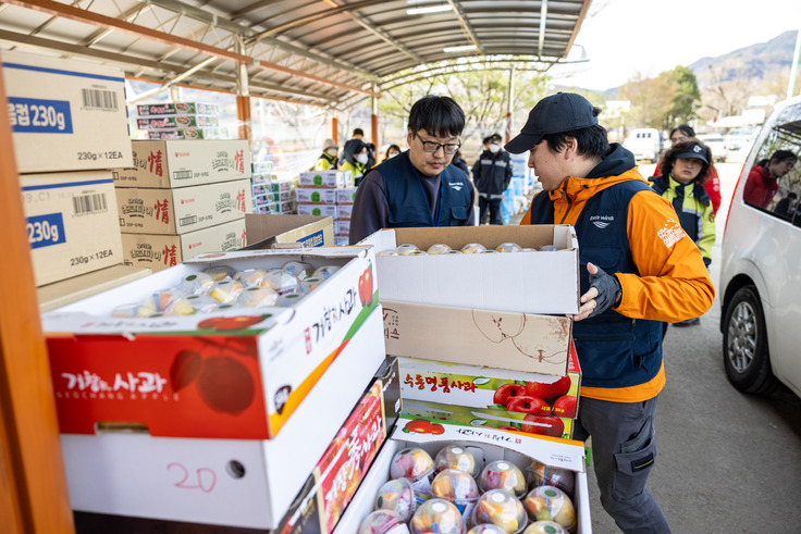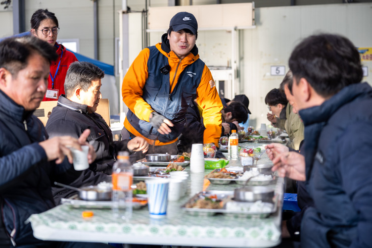 鎮火隊は、早朝、本部で食事をとるとそのまま目の前の山へ入っていきます。ピースウィンズはピースウィンズ・コリアと連携し、朝7時30分に本部を訪問。鎮火隊の人びとにフルーツなどの食糧支援を手渡しました。