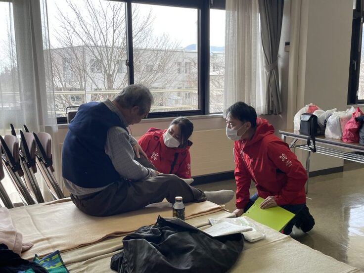 避難所にいると、なかには体調が悪くても誰かに伝えることができず、ときには自覚のないまま症状が悪化してしまうおそれがあります。通常、病院などでは来院する患者さんを診療しますが、災害時にはこうして避難所に出向き、取りこぼすことなく一人ひとりと向き合いながら話すことが求められます。