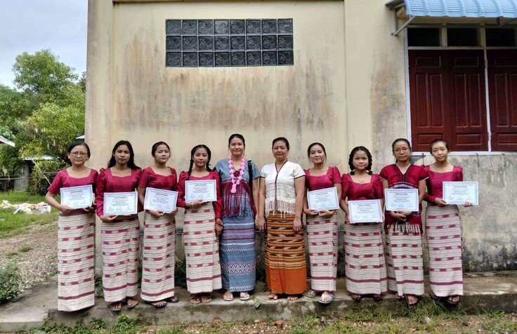 最終日は、こじんまりとしながらも心あたたまる卒業式になりました。みんなでおそろいの衣装を仕立てたのです。カレン族の伝統的な織物を使ったスカートに、研修で学んだ技術を生かして自分たちで縫い上げたブラウスを合わせました。鏡の前で見せ合う笑顔は、まるで晴れの日の花のようでした。