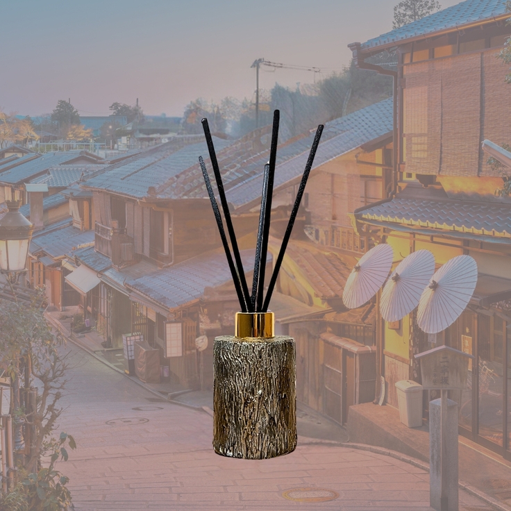 「In Kyoto」は、京都の静寂と精神性を感じさせる、深く落ち着いたウッディノートとインセンスの香りが特徴のリードディフューザーです。