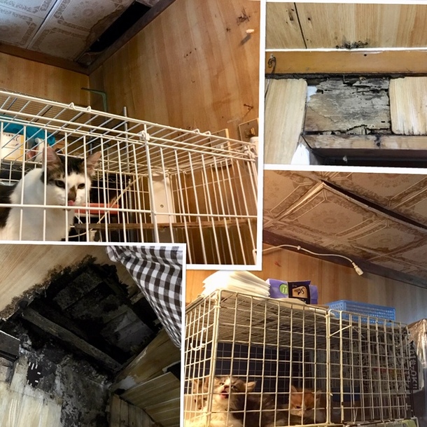 天井が剥がれ落ちてきた部分が3ヶ所あり、そこから天井裏の熱い空気が猫達のケージのほうに流れてくるようになってしまったのです。