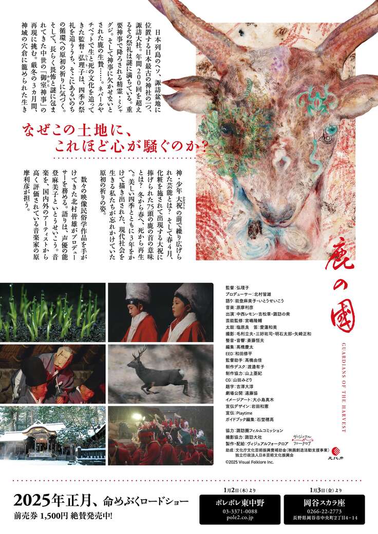 日本列島のヘソ、諏訪盆地に位置する日本最古の神社の一つ、諏訪大社。年間200回を超えるその祭礼は謎に満ちている。重要神事で降ろされる古い神・ミシャグジ。そして神事に欠かせないとされた鹿の生贄……。ネパールやチベットで生と死の文化を追ってきた監督・弘理子(ひろ・りこ)は、四季の祭礼を追ううち、そこにあるいのちの循環への原初の祈りに気づく。そして、長らく畏怖と謎に包まれてきた中世の「御室神事(みむろしんじ)」の再現に挑む。厳冬の3カ月間、神域の穴倉に籠められた生き神・少年大祝(おおほうり)の前で繰り広げられた芸能とは?そして春4月、化粧を施されて出現する大祝に捧げられた75頭の鹿の首の意味とは?冬から春へ、死から再生へ。美しい四季とともに3年をかけて描き出された、現代社会を生きる私たちが忘れかけていた原初の祈りの姿。
