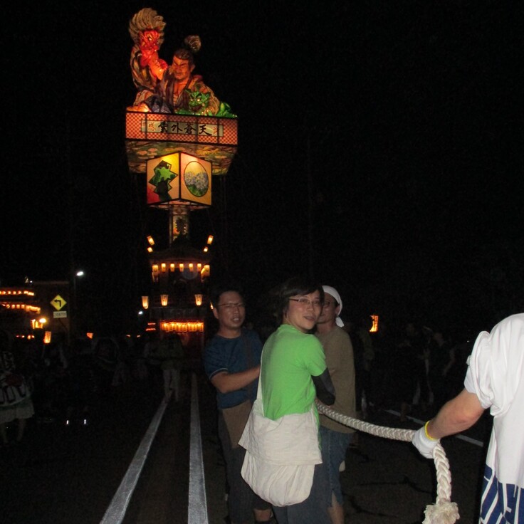 この時は、珠洲市の職員の方に、祭り会場を案内していただき、まつり関係者や地域の方々をご紹介いただきました。さらには、ご厚意で燈籠山も引くというサプライズも。