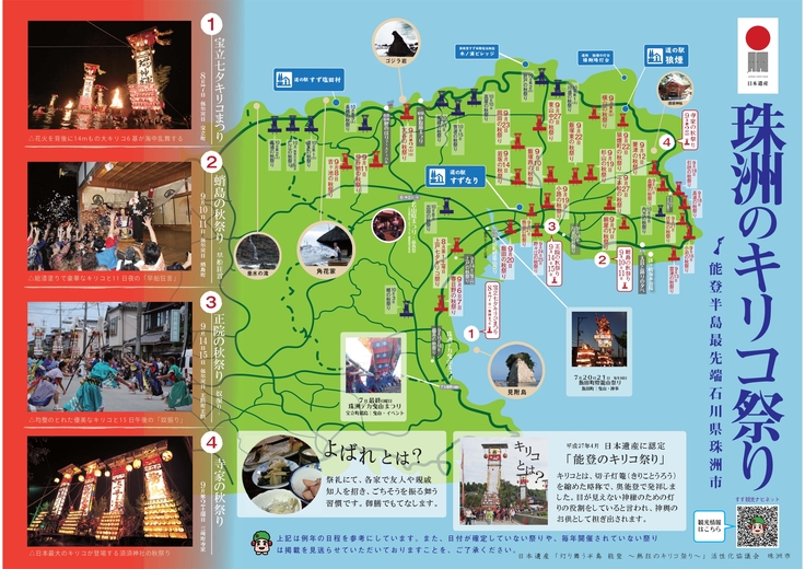 珠洲の祭りはこの他にも、宝立七夕キリコまつり〈8月5日(土)〉、砂取節まつり〈8月13日(日)〉、寺家の秋祭り〈9月9日(土)〉、蛸島の秋祭り〈9月10日(日)、11日(月)〉、正院の秋祭り〈9月14日(木)、15日(金)〉などがあります。