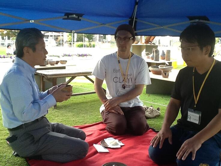 泉谷満寿裕 珠洲市長(写真左)も我々のブースにお越しくださり、備前焼の茶盌でお茶を召し上がっていただきました。このご縁がきっかけとなり、翌年の「アーティスト・イン・レジデンス珠洲」が開催されるということになった訳で…。戦国武将然り。茶の力は侮れません。