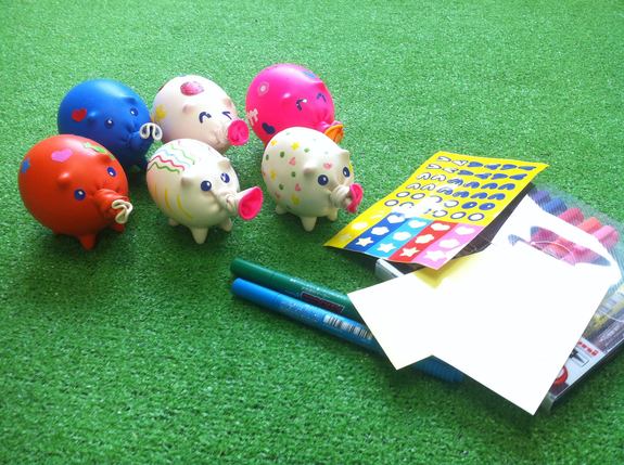 ブタ型の風船に小麦粉を詰めた上で、シール等で装飾し、握って遊べるおもちゃをつくるセットです。