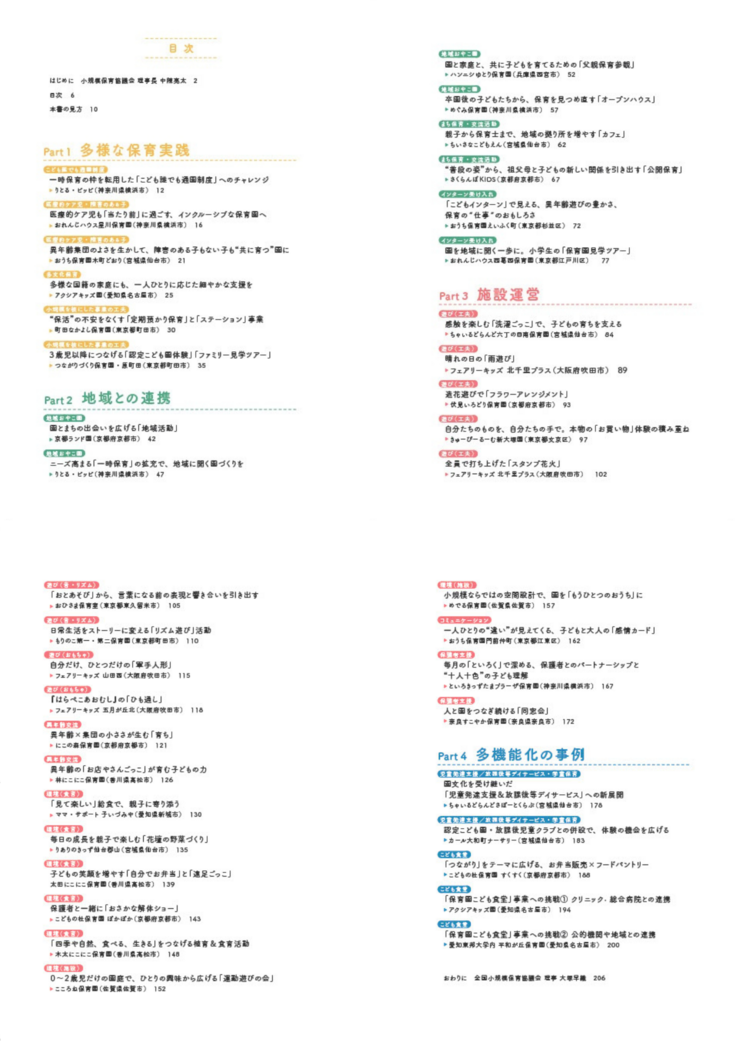 全国各地の事例をたくさんの写真とともに掲載し、小規模保育の多様な魅力と実践がぎゅっと詰まった一冊です。