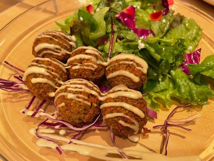 定番の「ファラフェル」(ひよこ豆のコロッケ)は、白ゴマのペーストと一緒に食べるのが最高!