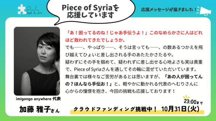 【応援メッセージ】imigongo anywhere 代表 加藤雅子さん