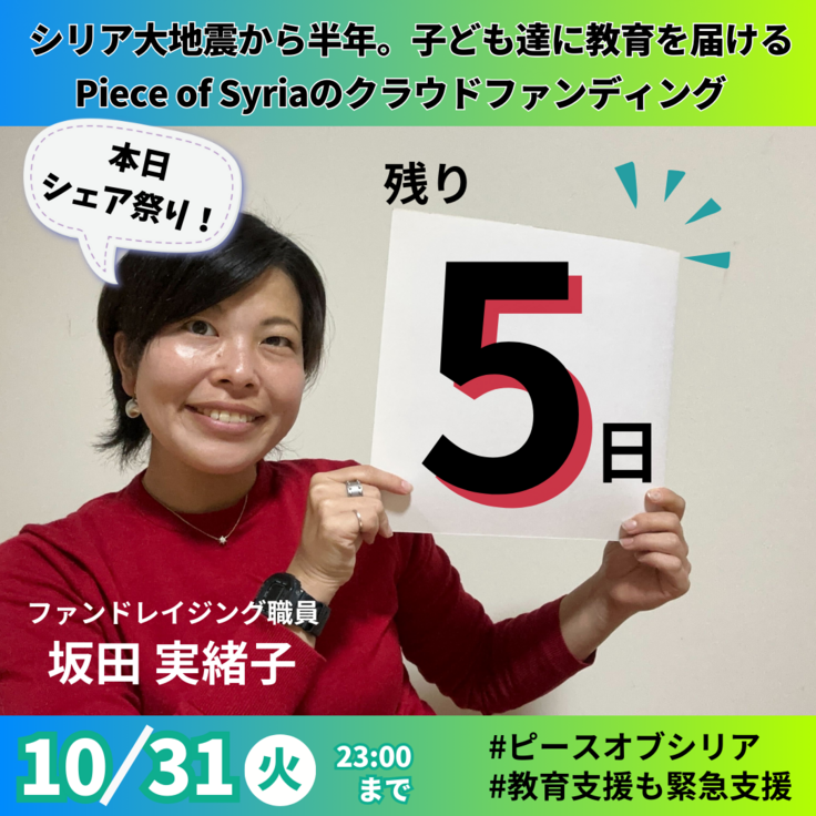【カウントダウン】残り5日!本日シェア祭り!スタッフ坂田実緒子よりメッセージ