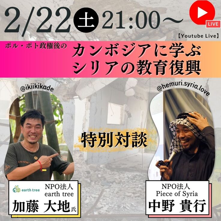 ポル・ポト政権の崩壊後、長い年月をかけて国を再建していったカンボジアで、幼稚園・学校・エコビレッジを作るNPO法人earth treeの代表・加藤 大地氏をゲストに、平和・戦後復興と向き合うシリアへのヒントを学ぶ対談です。