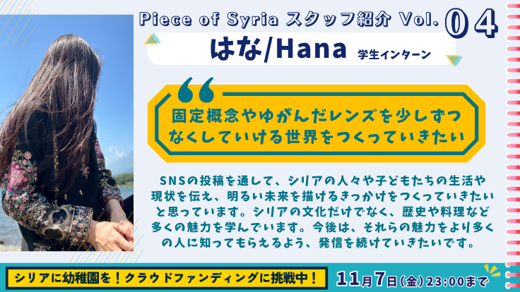 Piece of Syriaでは、イベントの進行やSNSを通してシリアの文化や生活を発信し、普段のメディアやニュースでは伝えきれない側面を多くの方に知ってもらうことで、固定概念やゆがんだレンズを少しずつなくしていける世界をつくっていきたいです。