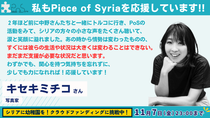 2年ほど前に中野さんたちと一緒にトルコに行き、PoSの活動をみて、シリアの方々の小さな声をたくさん聴いて、涙と笑顔に溢れました。