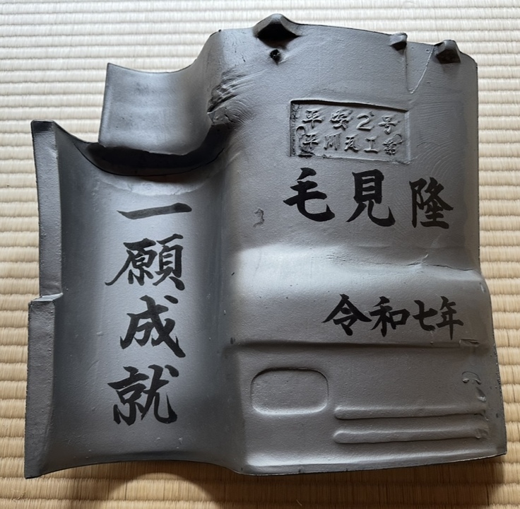 新たに葺き替える本堂屋根の瓦をご奉納いただきます。瓦裏面にご希望のお名前と「一願成就」を春岳院が書き入れさせていただきます。