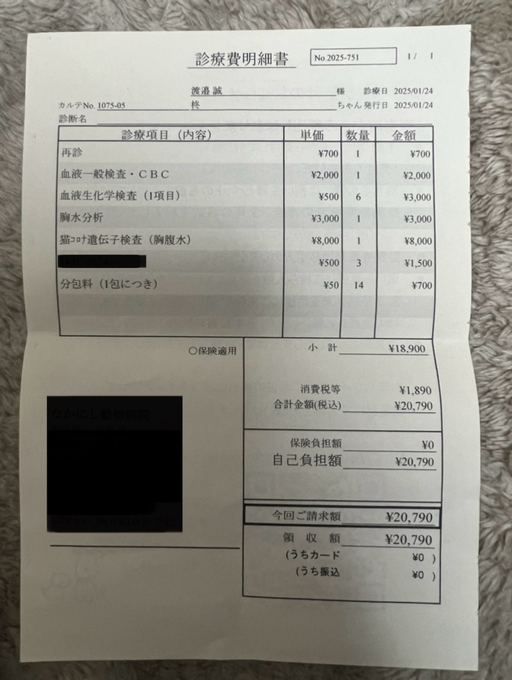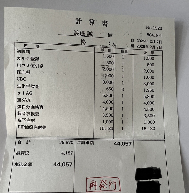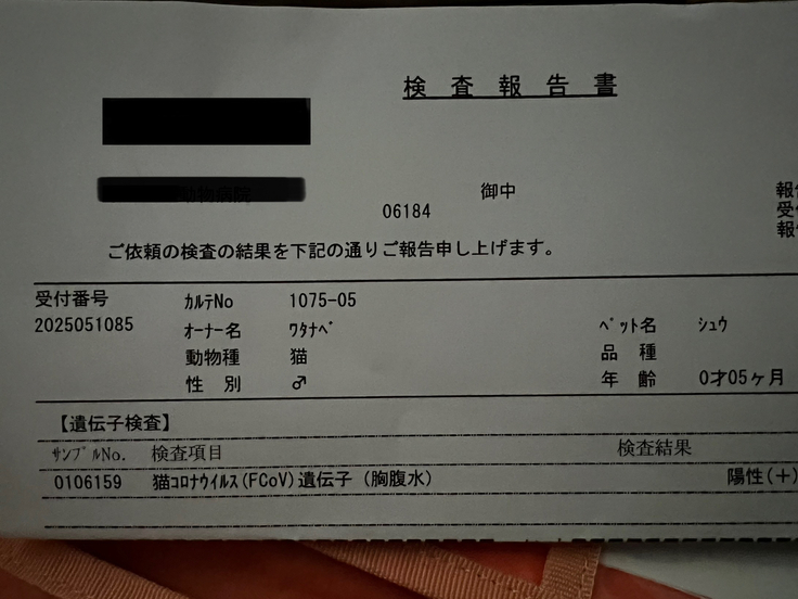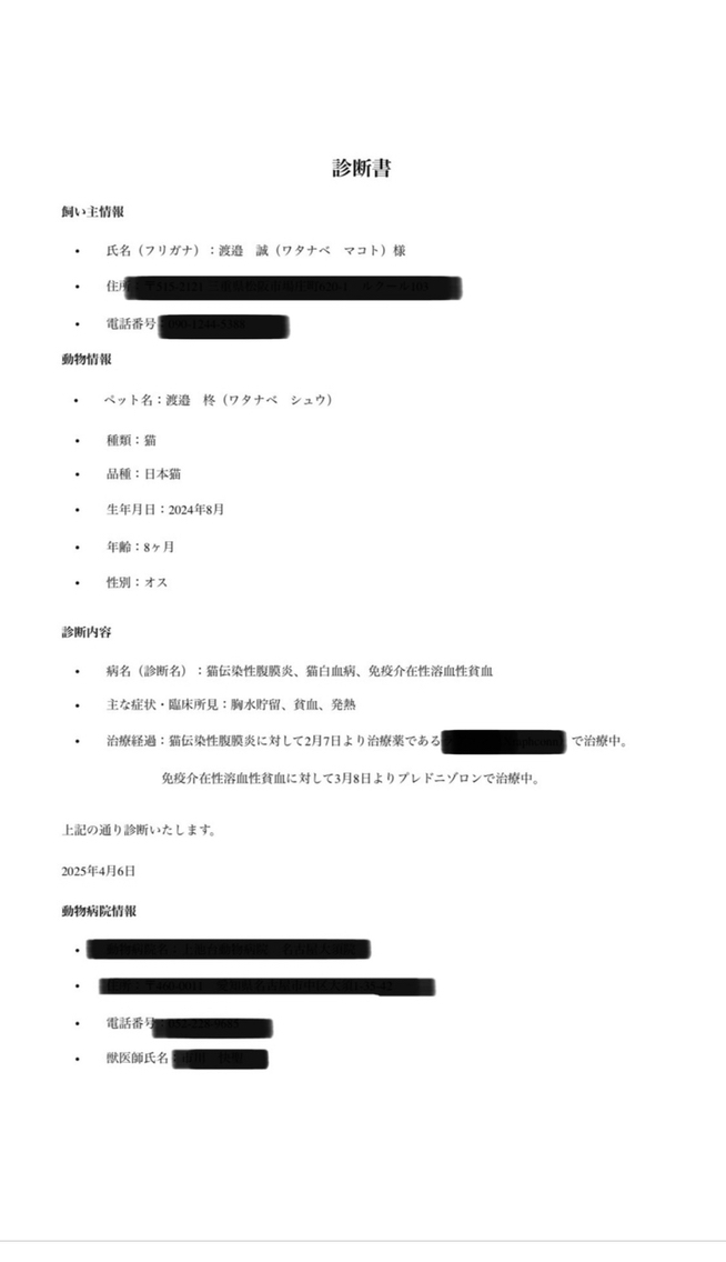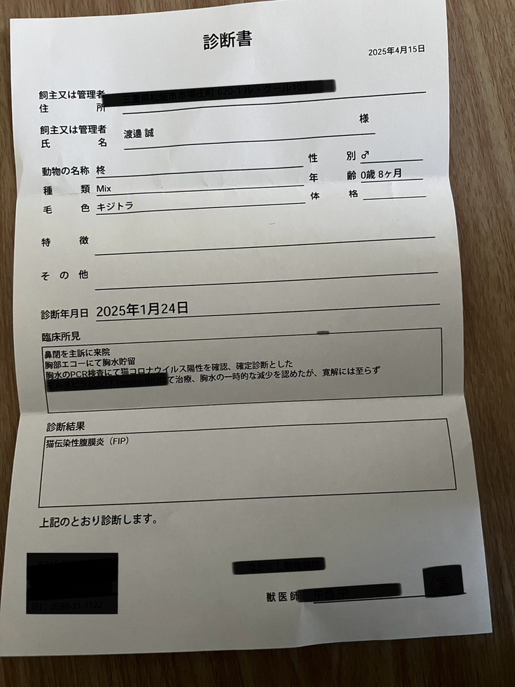 ※前回のプロジェクトの支援金について前回のプロジェクト支援金である100,000円ですが支援金は受け取っており2025年02月07日から2025年03月08日までのFIP及び猫白血病治療費に充当しています。