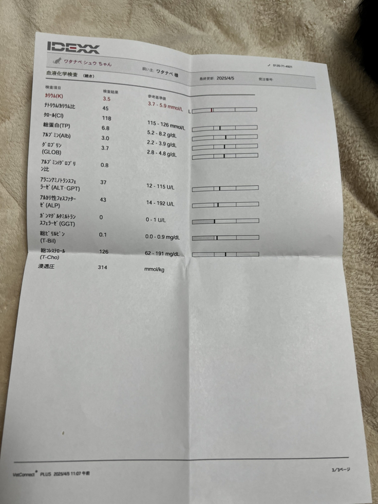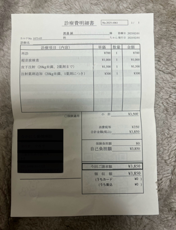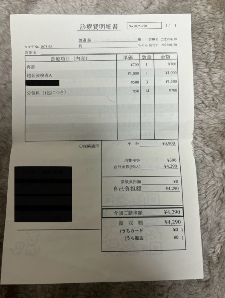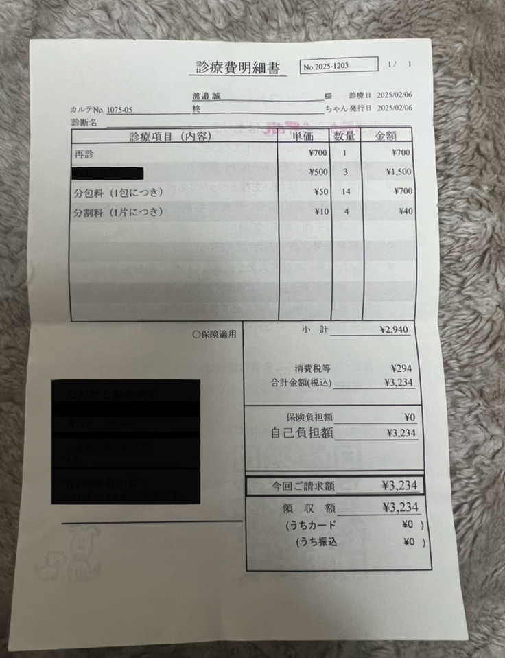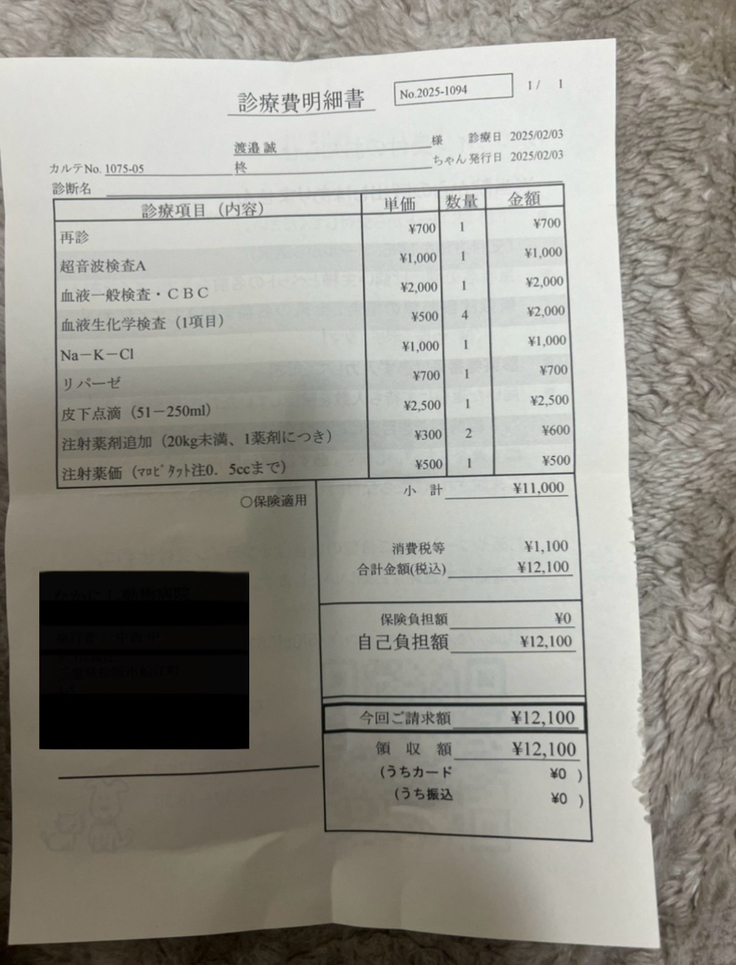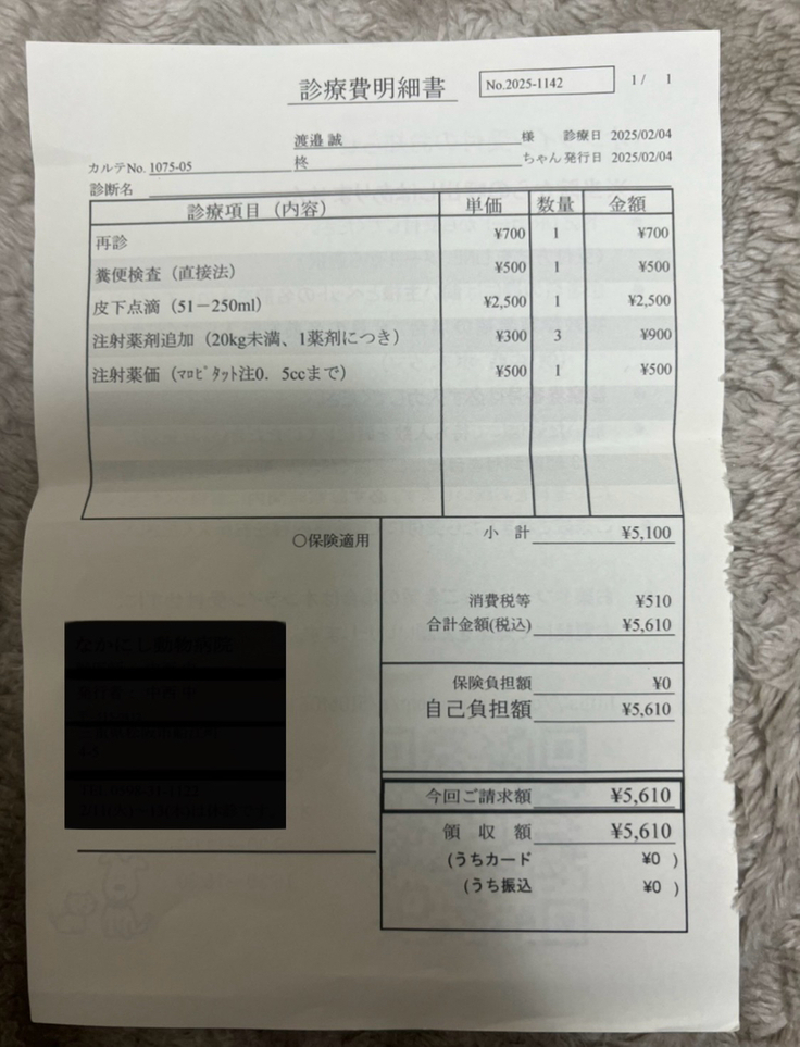 そこで皮下注射もある別のお薬を使いたく違う病院へ転院しました。2日間は皮下注射を行いました。その後は食欲も戻ったので内服に切り替えました。その時に費用も聞き薬800,000円+検査費用等かかるとのことでした。