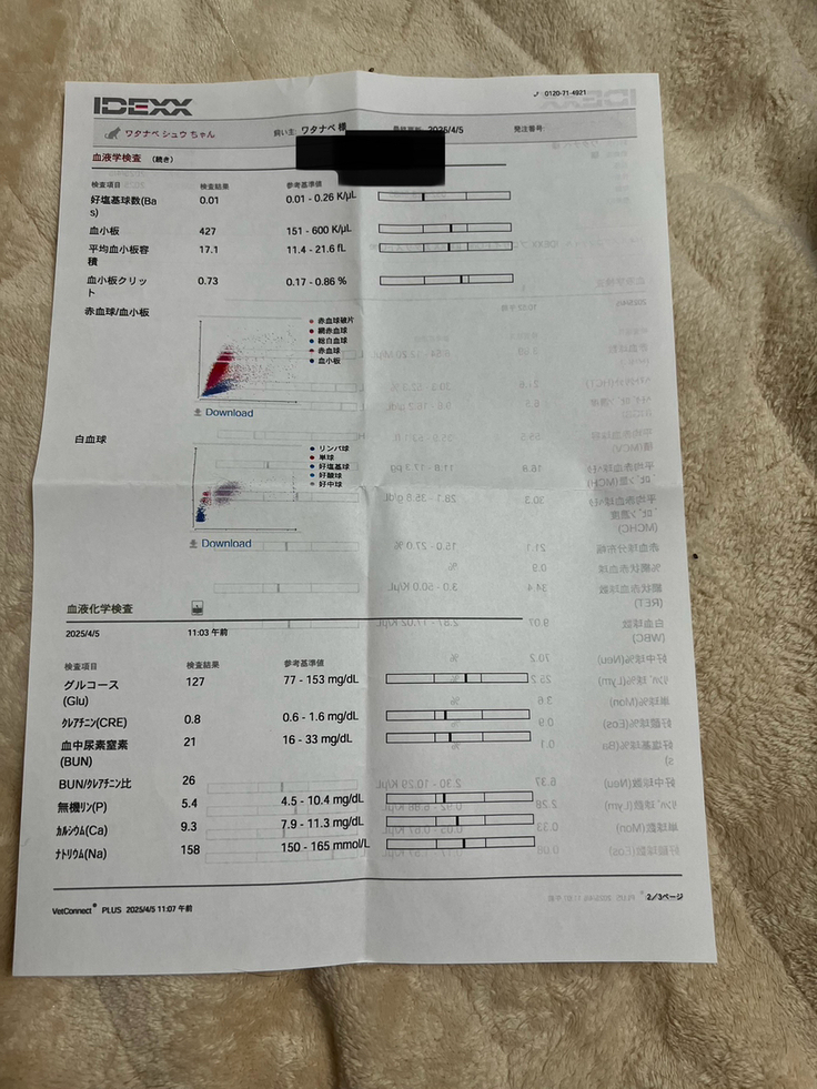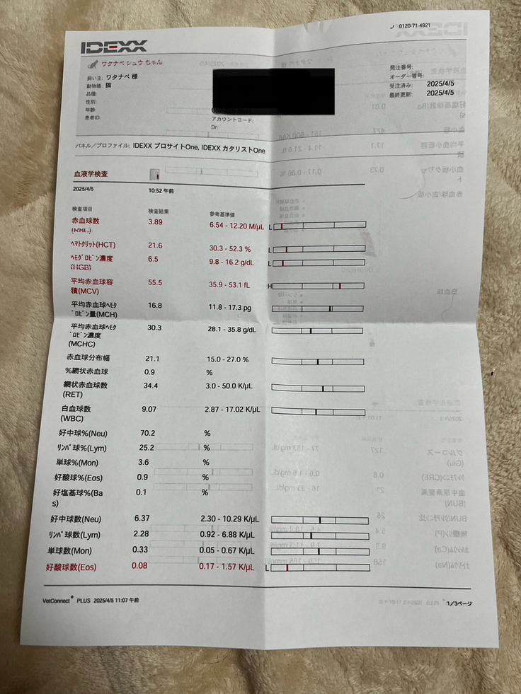 ※4月9日時点での血液検査です。貧血がまだ悪いままです。