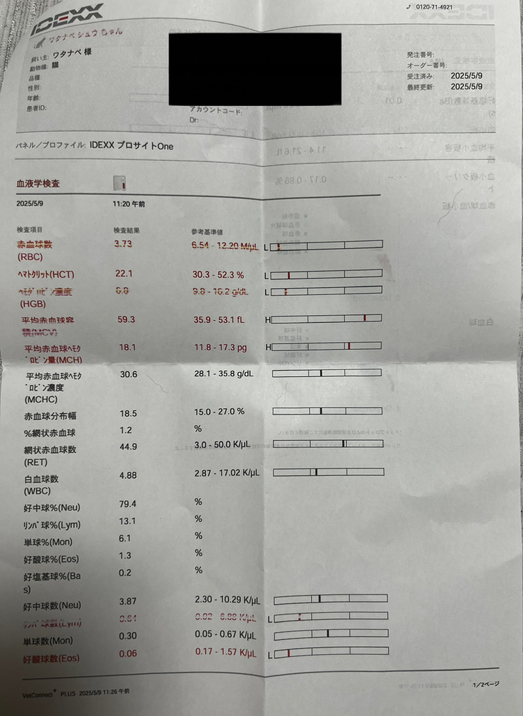 今日は血液検査を行いました。今の所食欲不振等不調は見られないので貧血の状況が心配です。