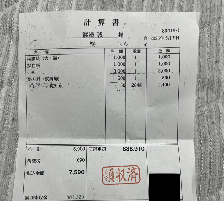 今回の診療費です。現在はその日の診療費に追加で過去の分の支払いも始めています。