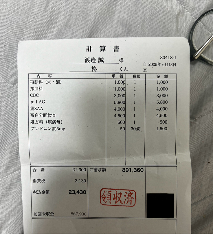体重も3.28kgとキープしており食欲もあるので落ち着いてはいるようです。外部検査の結果も含めてfipの経過を見るので結果が出次第報告致します。