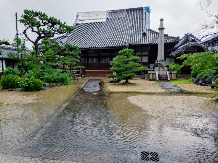 しかし、6月25日の午前中に大阪府富田林市は豪雨となり、山門から本堂に続く参道が池のようになりました。
