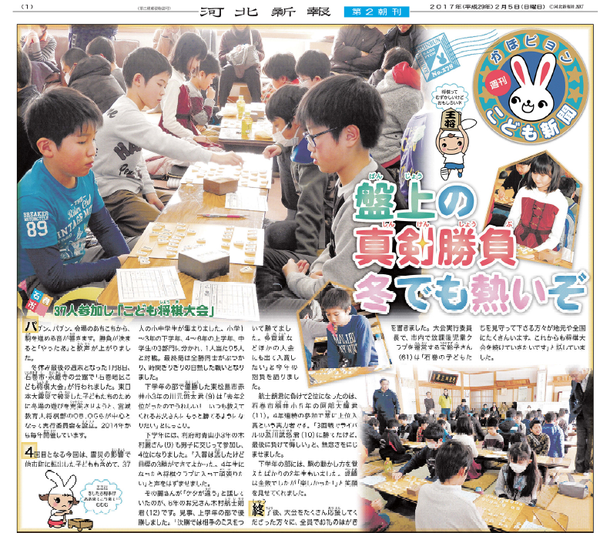 将棋大会から1と月が経って、子ども達は進級の準備や入学の準備で心が浮き立っている時期になりました。さて、宮城県内で発行される2月5日の「こども新聞」に第4回こども将棋大会の記事が載りましたのでお知らせいたします。子どもたち一人一人の声がとてもほほえましく感じられます。皆様のおかげと感謝しています。本当にありがとうございました。