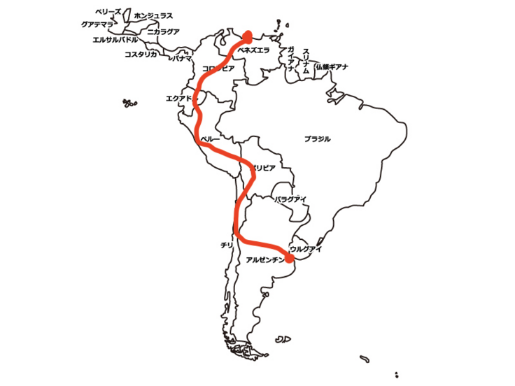 アルゼンチン🇦🇷→チリ🇨🇱→ボリビア🇧🇴→ペルー🇵🇪→エクアドル🇪🇨→コロンビア🇨🇴→ベネズエラ🇻🇪