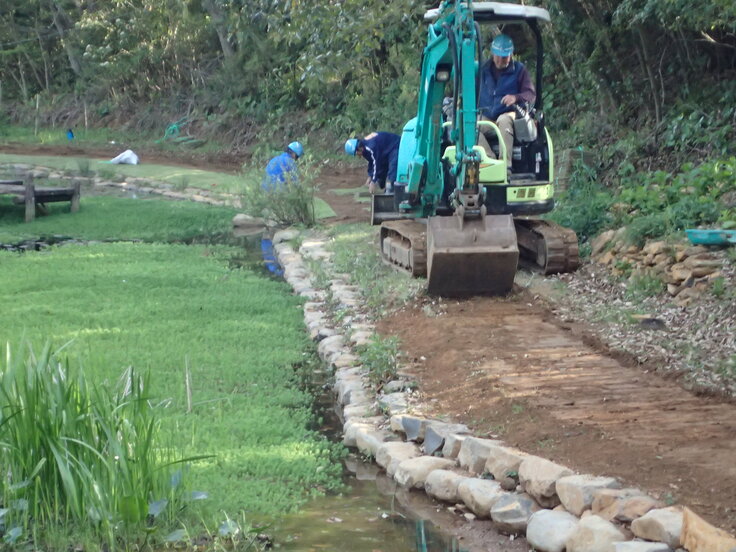 第一目標の水辺の整備(滑落防止)工事に着工いたしました。今回、石垣と芝生による安全な環境整備を行っておりますので、ご報告いたします。