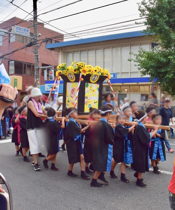 神輿は2基ありまして、写真の神輿は、ひまわり神輿。主に低学年が担ぎます。
