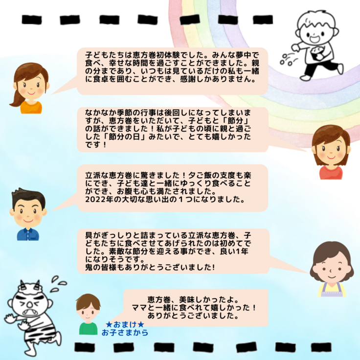 プロジェクト実行後、立川SDGsつなGO!委員会より、恵方巻を受け取った方々のお礼の声を含め、メッセージをお送りいたします。