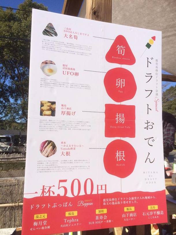 このマルシェで、クラウドファンディングの告知と山田さんからのメッセージを添えたボードを張り出し、おでんと一緒にDMを配らせていただきました。