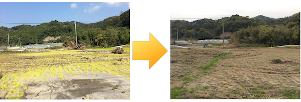橋を過ぎた所の畑。流木と砂の除去が終わり、新しい草が生えてきています