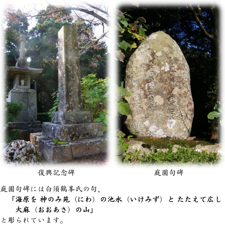 しかし、大正14年、氏子の要請により、当時近隣の駐在であった白須鶴峯(しらす かくほう)【現宮司、白須信男(しらす のぶお)の祖父】が宮司となり、身命を投げ打って復興にあたりました。昭和3年には現拝殿の再建、さらに京都においてさえ、その名が知られていた大麻山神社の庭園の復元をも成し遂げました。